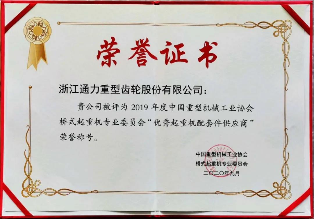 近日,通力收到了一份中國重型機(jī)械工業(yè)協(xié)會(huì)橋式起重機(jī)專業(yè)委員會(huì)頒發(fā)的榮譽(yù)證書,通力被評(píng)為2019年度中國重型機(jī)械工業(yè)協(xié)會(huì)橋式起重機(jī)專業(yè)委員會(huì)“優(yōu)秀起重機(jī)配套件供應(yīng)商”的榮譽(yù)稱號(hào)。