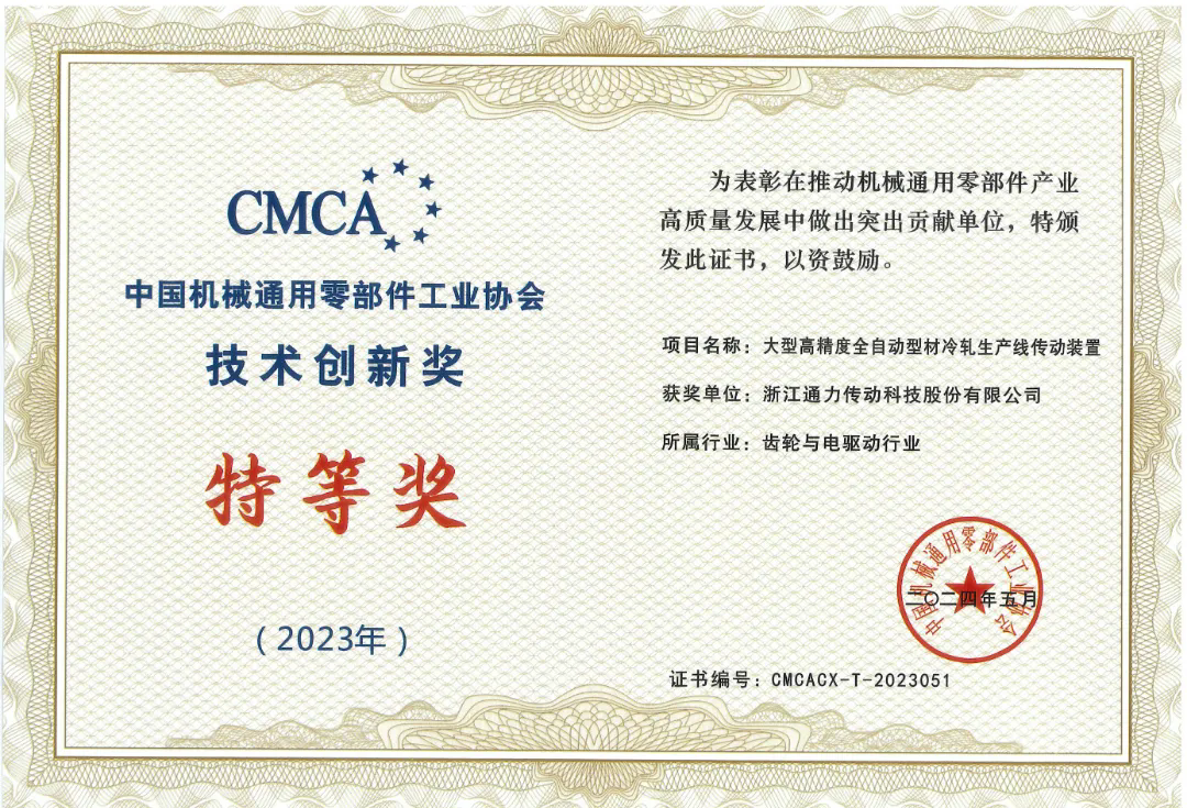 近日,中國機械通用零部件工業(yè)協(xié)會(huì )技術(shù)創(chuàng )新獎揭曉,通力科技大型高精度全自動(dòng)型材冷軋生產(chǎn)線(xiàn)傳動(dòng)裝置榮獲特等獎。